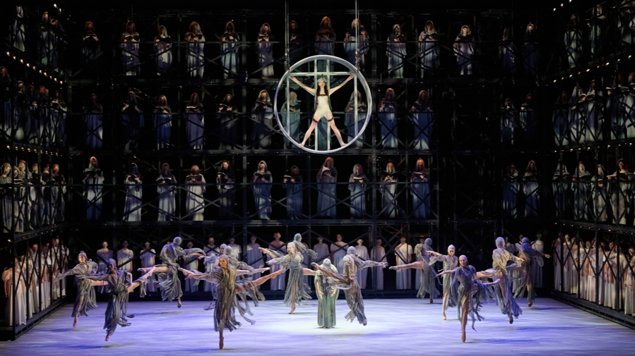 视觉上,这部作品更是“诚意拉满”。卫承天兼任布景设计,用 8 米高的环绕式高台还原修道院的氛围,上海音乐学院合唱团与上海市黄浦区青少年艺术活动中心春天少年合唱团的成员将层层站在高台上,与台下的香港管弦乐团呼应;舞台中央的高空中,一个轮盘悬挂着,舞者伸展四肢站在其中,宛如达芬奇《维特鲁威人》的复刻 —— 这既呼应了《哦,命运》里的 “命运之轮”,也像主角“奥兰多”一生追逐的、遥不可及的“天使”。