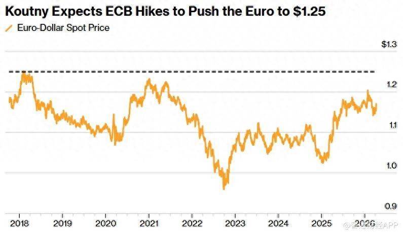 Koutny进一步指出,若欧洲央行连续两次加息,欧元有望在年底升至1.25美元,较当前水平上涨近7%,并创下八年来新高,这一预测也与市场调查中的最高预期一致。