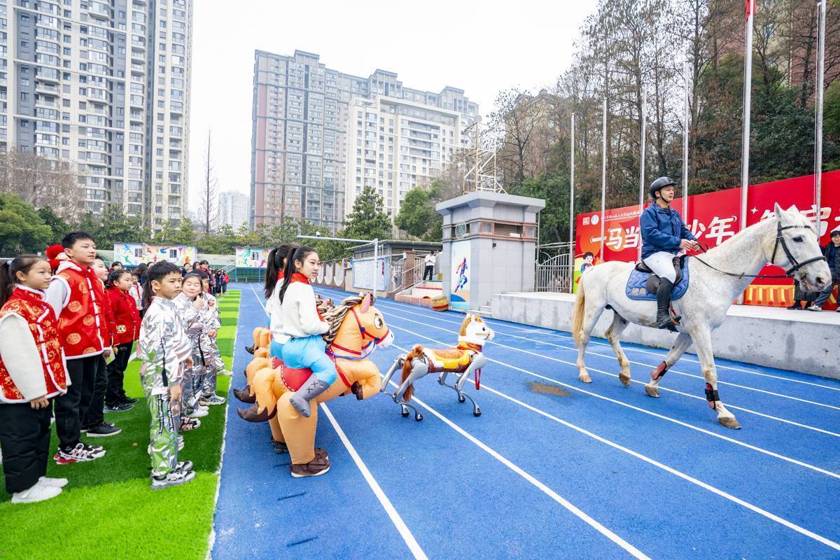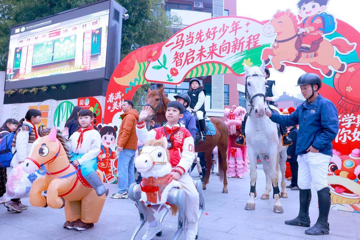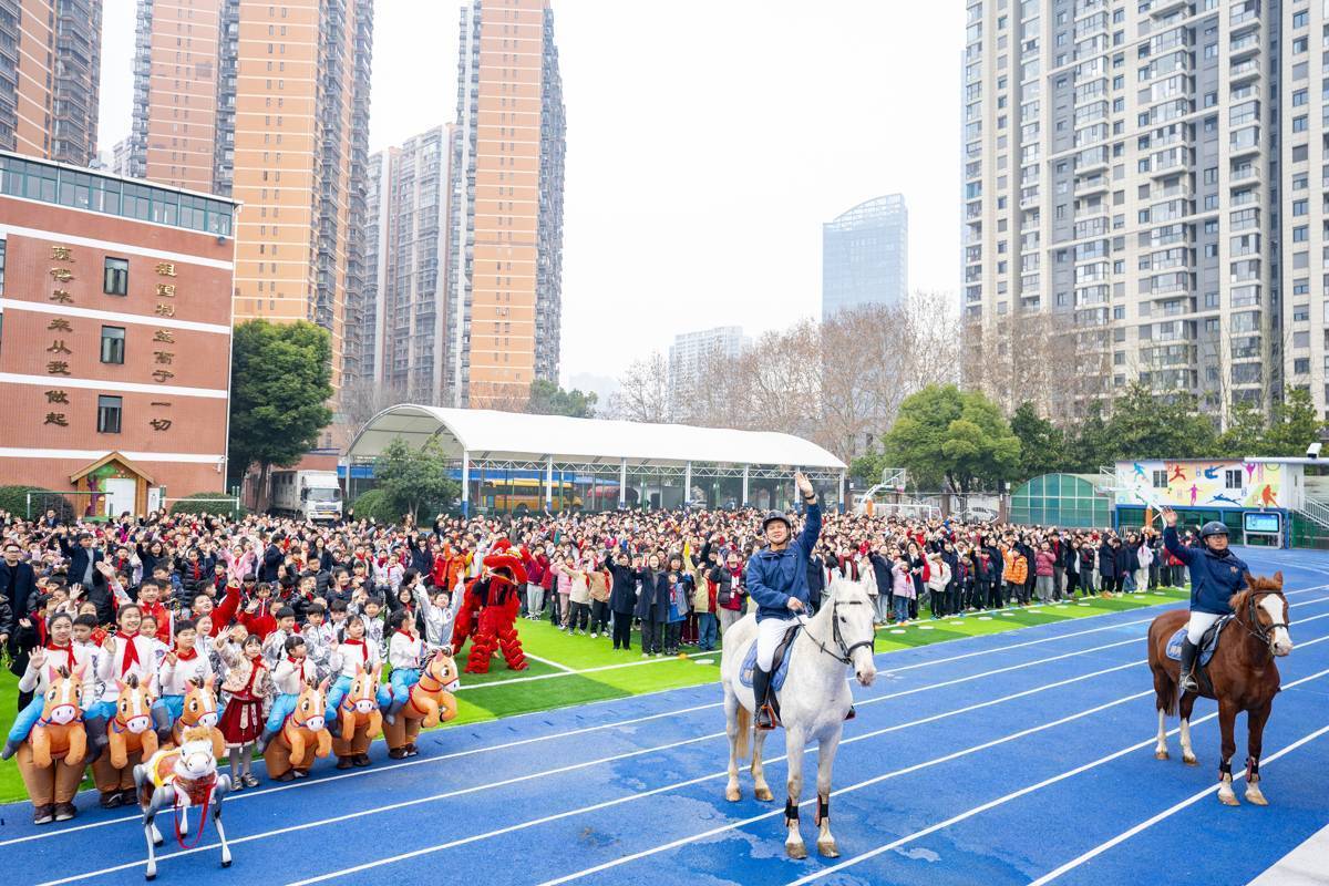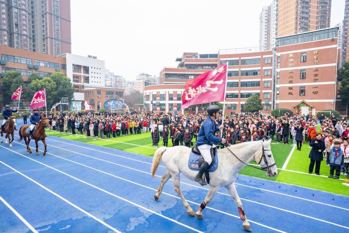 开学典礼上,三匹骏马绕操场一周,三位骑士手持“一马当先”“马力全开”“马到成功”旗帜,把新学期最美好的祝福送给同学们。
