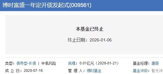 截至2026年1月5日,该基金出现连续五十个工作日基金资产净值低于五千万元的情形,已触发《基金合同》中约定的基金终止条款。根据《基金合同》有关约定,博时基金管理有限公司应依据基金财产清算程序对该基金进行财产清算并终止基金合同,且无需召开基金份额持有人大会。